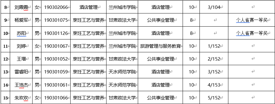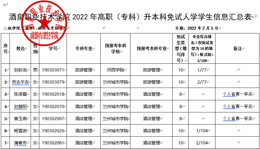 根据《2022年甘肃省普通高校高职(专科)升本科免试生招生工作实施方案》的有关要求,酒泉职业技术学院旅游与烹饪学院严格按照文件要求进行审核,现将高职(专科)专升本考试免试入学学生名单予以公示,公示期限3天,请广大师生予以监督,若有不实情况,拨打监督电话:13893789780/18893586671。