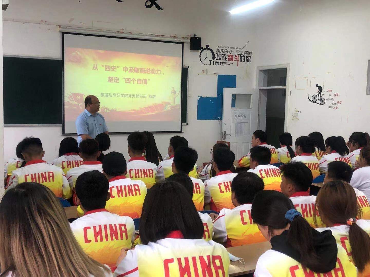 为了让广大师生学党史、悟思想、办实事、开新局按照党史教育的整体安排,6月15日下午,旅游与烹饪学院党支部书记、院长杨洁在213会议室和706教室分别召开以“从‘四史’中汲取前进动力,坚定‘四个自信’”为主题的党课。旅游与烹饪学院的全体教师和部分专业学生聆听了党课。