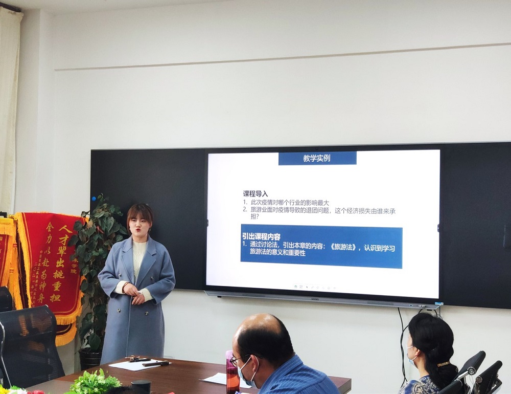 学院年轻教师霍亿亿、董轩、魏忠杰、张雪婷、常诗雅、尉志强、邓君雅等七位老师对本学期承担课程进行了说课,年轻教师分别从课程定位到课程标准、教材分析到学情分析、教学目标制定到重难点把握、教法学法的选择到教学设计的实施等方面进行说课;过程中,专业教师和年轻教师们就学情分析、课程标准、教学方法以及如何说课等方面进行交流和互动。最后,杨洁院长对此次说课活动做出点评:首先肯定了年轻教师在教学业务和能力上有了很大提升,对所授课程内容、教学目标以及重难点、学情分析和教学方法的等方面建立了适合自己的授课方式,美中不足的是实战经验较少,案例代表性不强;杨院长同时强调,如何结合人才培养方案,制定切实可行的课程标准,教无定法,探索适合学院学情的教学设计,解决好人才培养的最后一公里难题。
