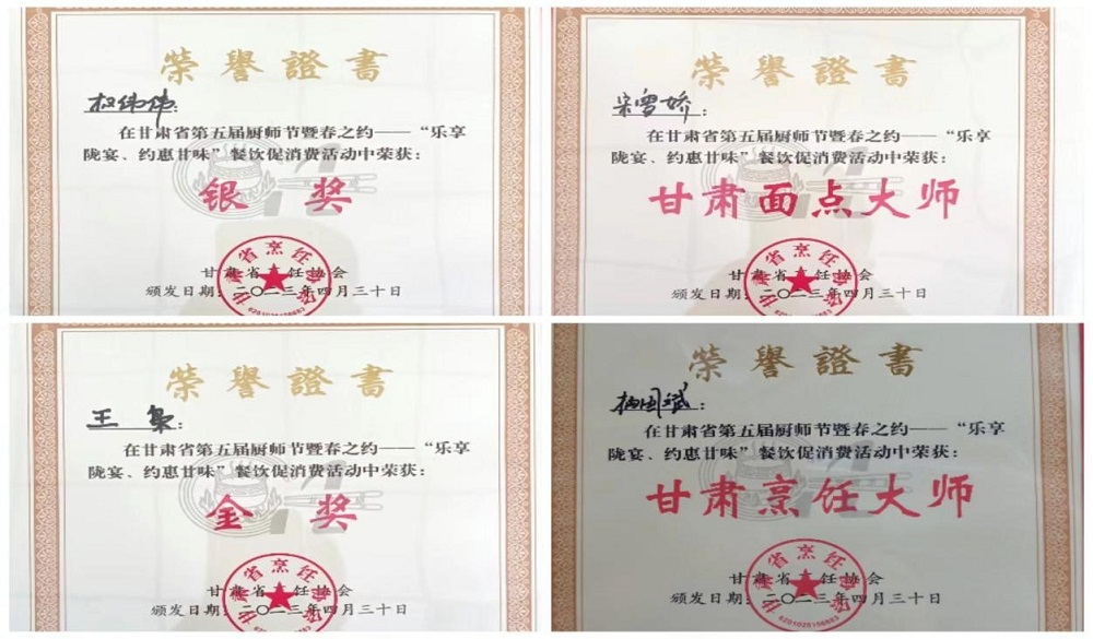 经过激烈角逐,我校选送的面点作品绵羊酥、塞外琵琶获得中式面点赛项金奖1个,银奖1个;南山听松(祁连松鼠鱼) 、傲雪凌霜(金丝龙抓菊)、硕果累累(荔枝妃子笑)过得中式热菜赛项金奖3个;冷拼作品丝路迎宾、鸟语花香获得食雕、冷拼赛项金奖2个,教师杨国斌获得“甘肃省烹饪大师”荣誉称号,宋雪娇获得“甘肃省面点大师”荣誉称号,学生权伟伟、李志建、王枭被评为“甘肃省烹饪名师”。