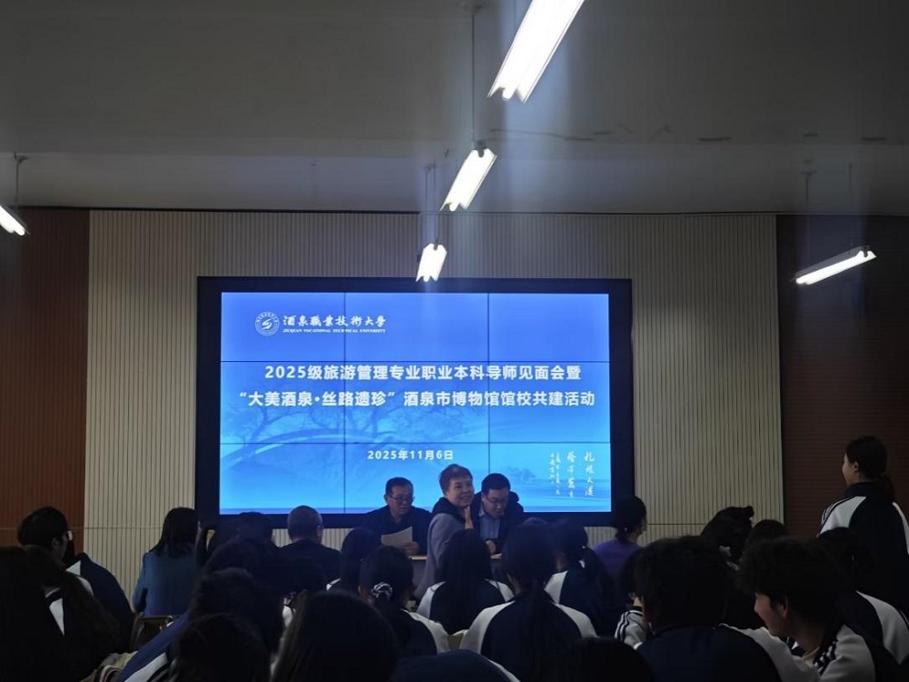 为深化职业本科人才培养模式改革,加强新生与导师的沟通,并依托地方文化资源,创新实践教学形式,提升学生的专业认同与实践能力。2025年11月6日,旅游与烹饪学院举办2025级旅游管理专业职业本科导师见面会暨“大美酒泉·丝路遗珍”馆校共建活动。会议由旅游与烹饪学院副院长董轩主持,党支部书记张来顺及全体旅游管理系教师参加。